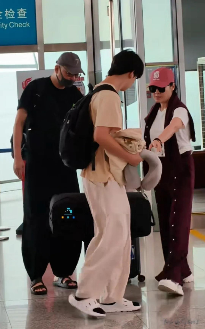 八月底。各中小学开学在即,外地上学的孩子已经在回学校的路上了。8月29日,梁静管虎夫妇一同来到机场,送儿子犇犇去学校。
